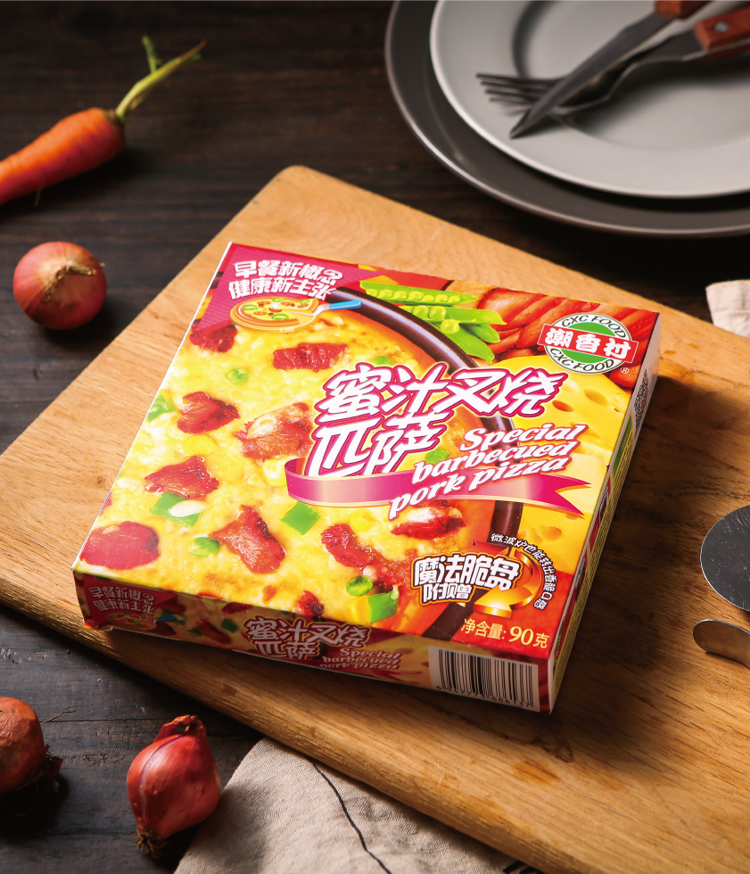 產(chǎn)品介紹:蜜汁叉燒匹薩——選用肥瘦均衡的豬肉腌漬后烤制而成的叉燒,軟嫩多汁、色澤鮮明、香味四溢,這個(gè)來(lái)自廣東的特色美食佐以番茄醬和乳酪,加熱后從叉燒肉中滲出的油脂和飴糖與乳酪的奶香味混合在一起,別有一番風(fēng)味。 工藝:半制成品 規(guī)格(g):90g 包裝規(guī)格:1片/盒 箱規(guī):40盒/箱