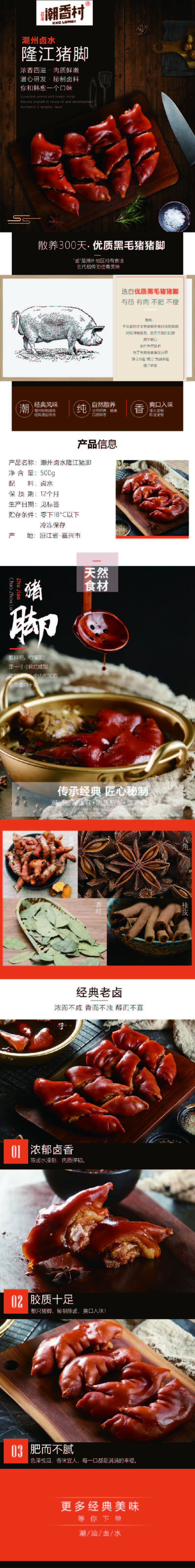 產品介紹:潮州鹵水 隆江豬腳——韓愈的最愛!相傳,千年前的大文學家韓愈食過這款豬腳,對其彈嫩糯香、肥而不膩的口感贊不絕口,親自為它題名,為了與其他美食區(qū)分開,便以地名“隆江”為其命名--隆江豬腳。從此,隆江豬腳名揚四海,備受廣東人民歡迎,當地流傳著這樣一句話:“吃隆江豬腳要用鐵絲箍住舌頭,不然會把舌頭和豬腳一起吞下。” 工藝:陳鹵鹵制 規(guī)格(g):500g 包裝規(guī)格:500g/袋 箱規(guī):無